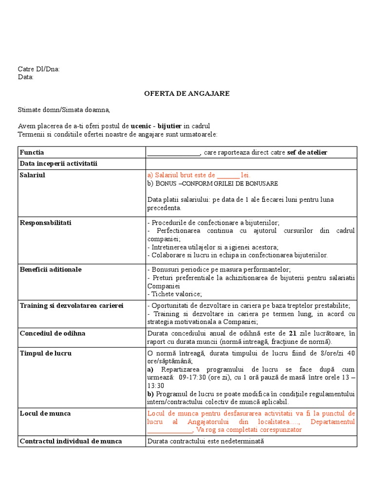 Termenii si conditiile ofertei noastre de angajare sunt urmatoarele: