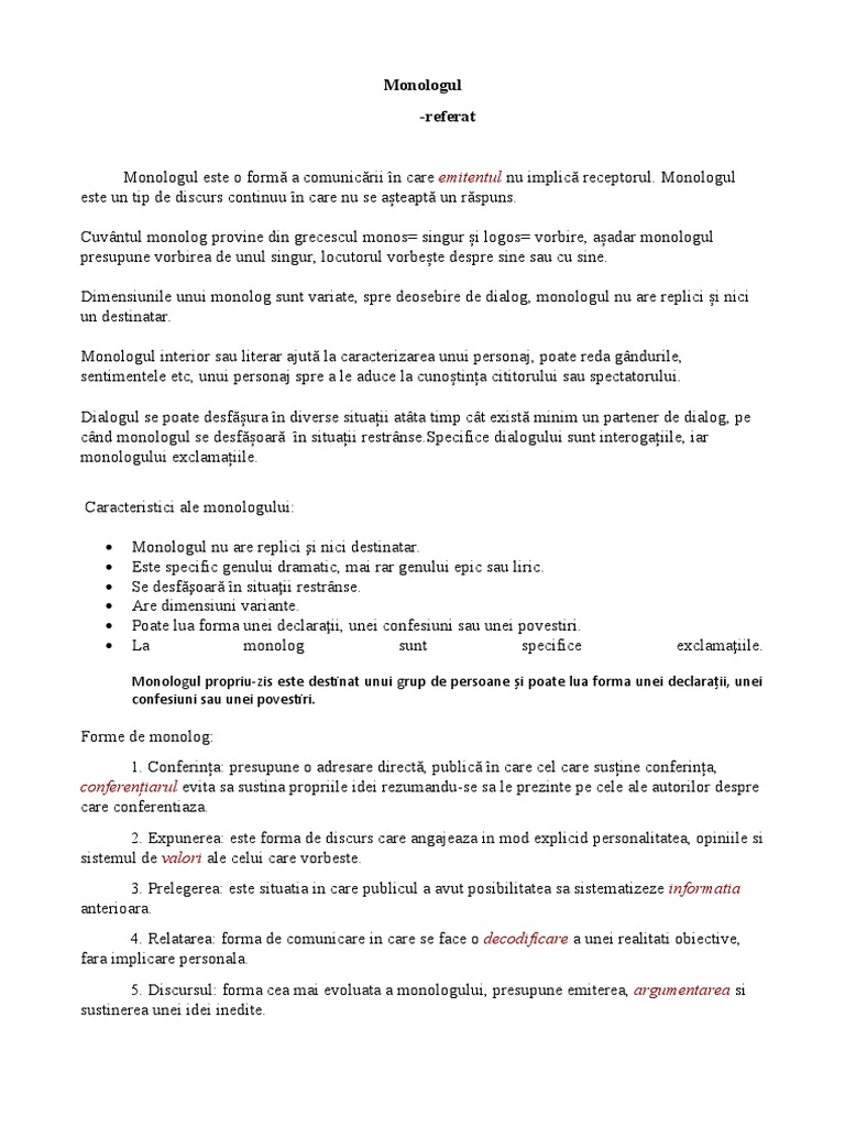 Monologul nu are replici şi nici destinatar.