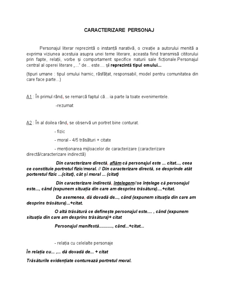 urmat, mijloacele de caracterizare variante contribuind la evidențierea unui personaj