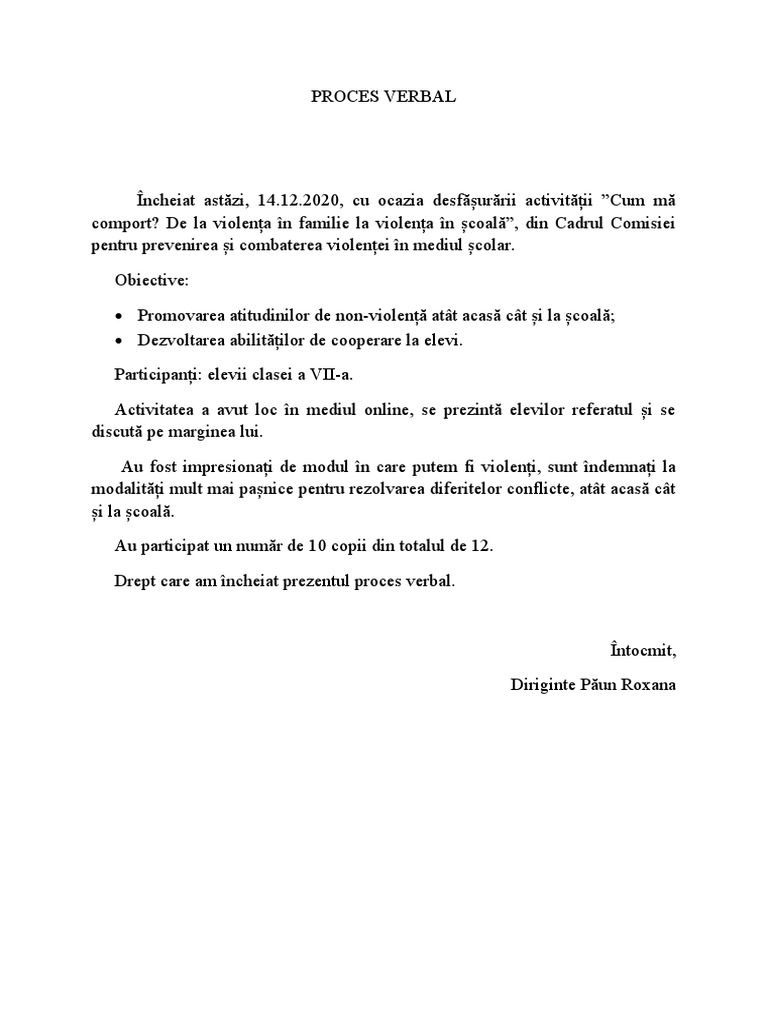 Încheiat astăzi, 14.12.2020, cu ocazia desfășurării activității ”Cum mă