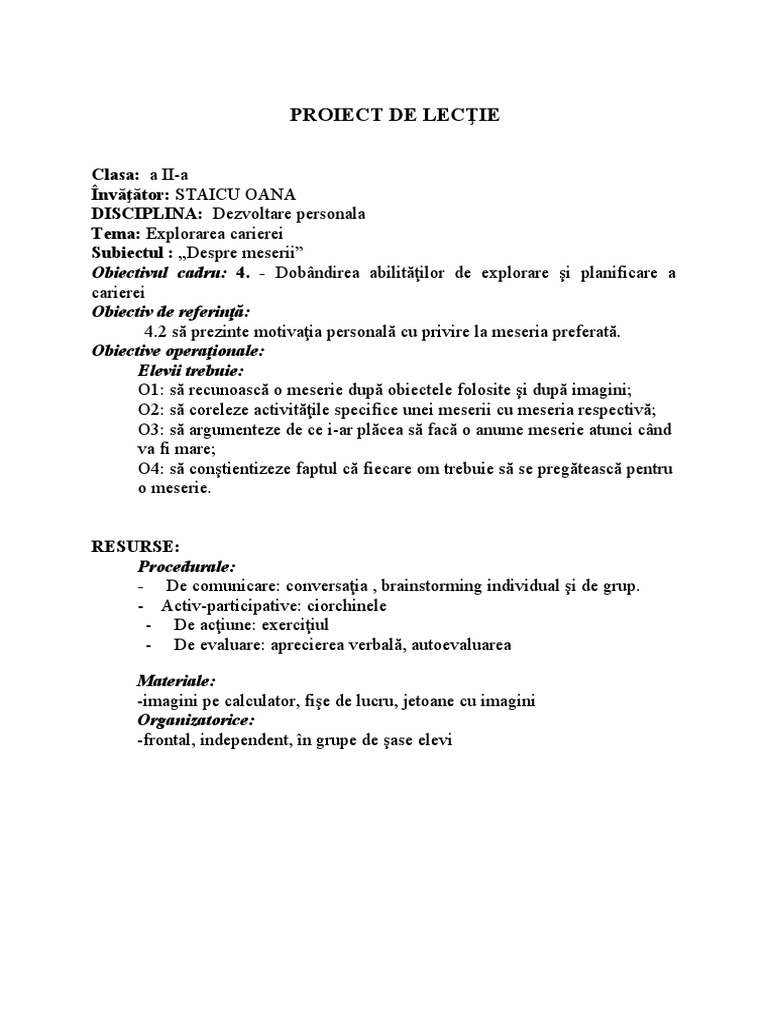 O1: să recunoască o meserie după obiectele folosite şi după imagini;