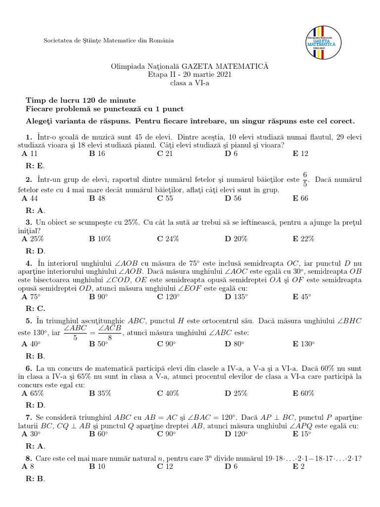 Alegeţi varianta de răspuns. Pentru fiecare ı̂ntrebare, un singur răspuns este cel corect.