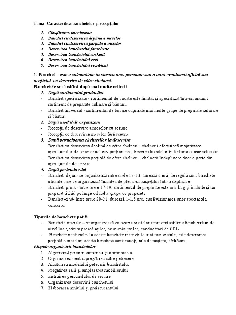Tema: Caracteritica banchetelor și recepțiilor