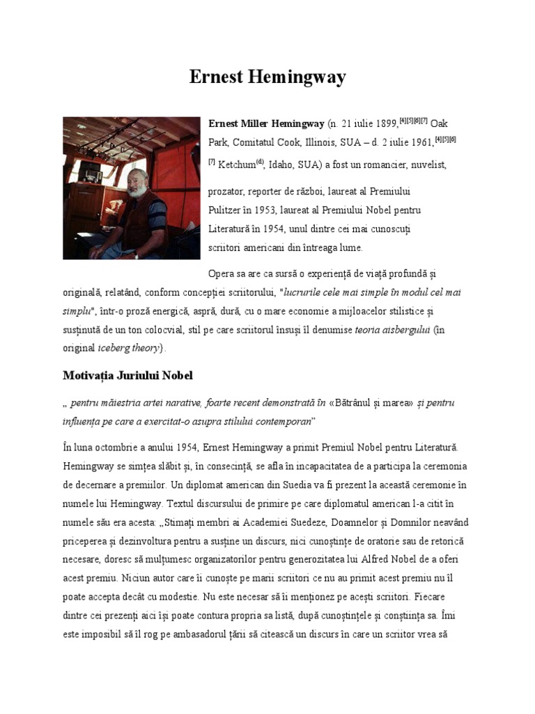 de povestiri, nuvelist și romancier, Ernest Hemingway impresionează prin utilizarea unui număr