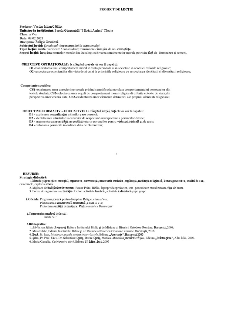 Scopul lecţiei: însuşirea normelor morale din Decalog; cultivarea sentimentelor morale potrivite faţă de Dumnezeu şi semeni.