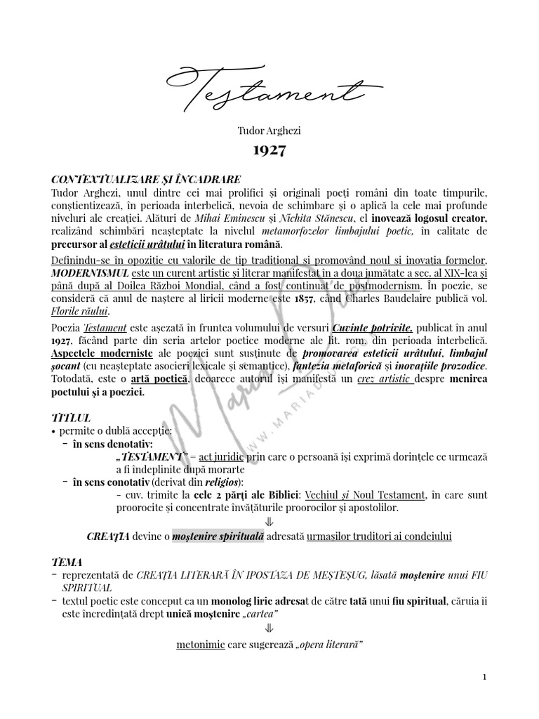 În opinia mea, opera literară Testament, de Tudor Arghezi, este o artă poetică modernă, poetul