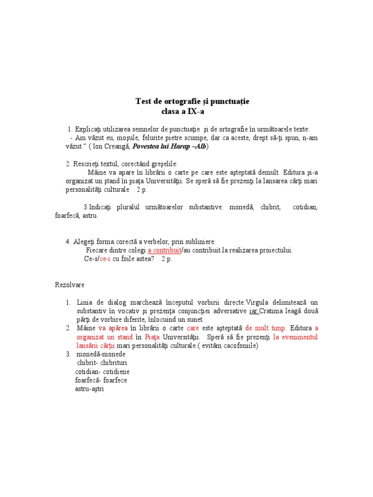 1. Explicaţi utilizarea semnelor de punctuaţie şi de ortografie în următoarele texte: