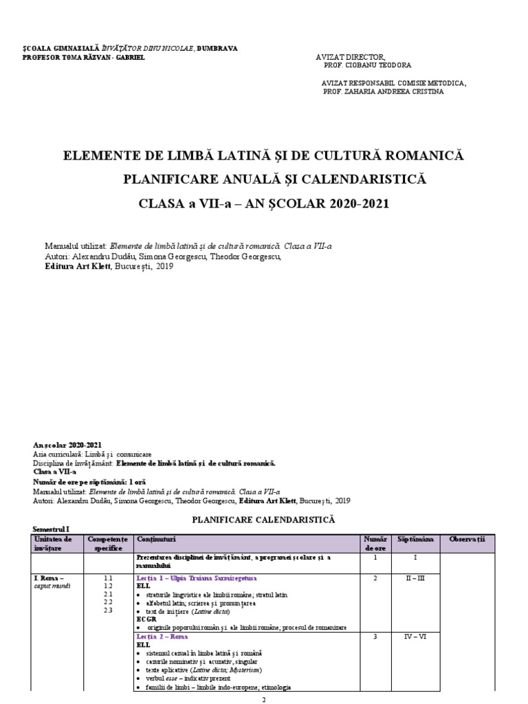 Manualul utilizat: Elemente de limbă latină și de cultură romanică. Clasa a VII-a