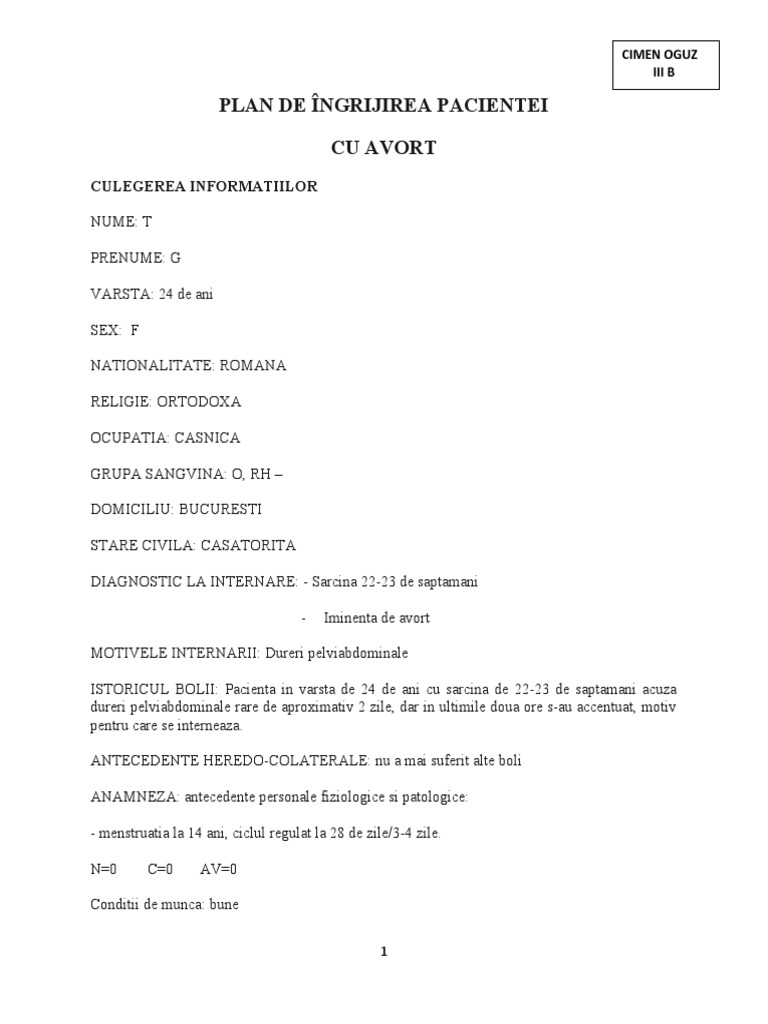 PLAN DE INGRIJIRE A PACIENTEI T. G. IN A III-A ZI DE SPITALIZARE