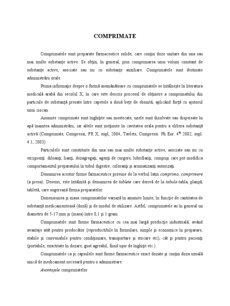 principala formă farmaceutică orală dozată. Folosirea pe larg a comprimatelor se justifică prin