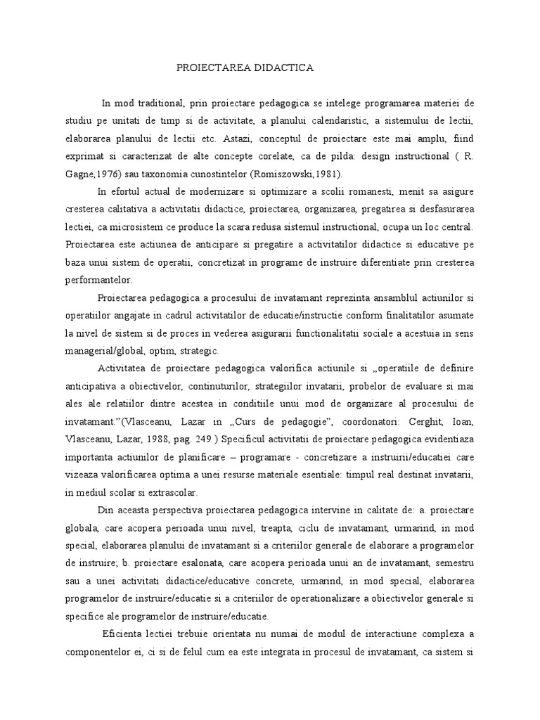 continut, strategii si evaluarea rezultatelor). Activitatea de proiectare pedagogica implica