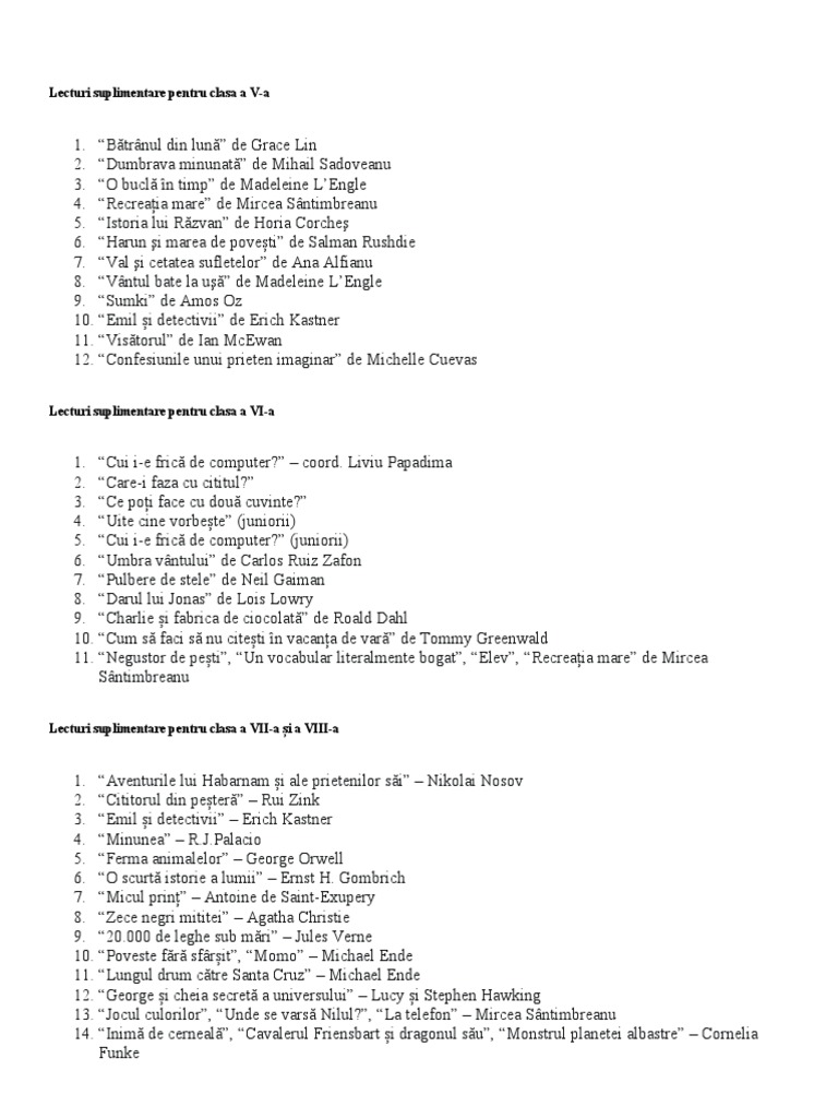Lecturi suplimentare pentru clasa a V-a