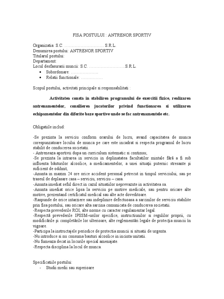 antrenamentelor, consilierea jucatorilor privind functionarea si utilizarea