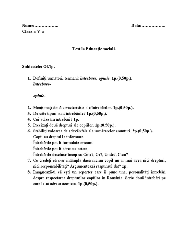 1. Definiţi următorii termeni: întrebare, opinie. 1p.(0,50p.).