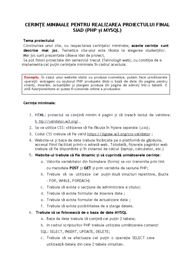 CERINȚE MINIMALE PENTRU REALIZAREA PROIECTULUI FINAL