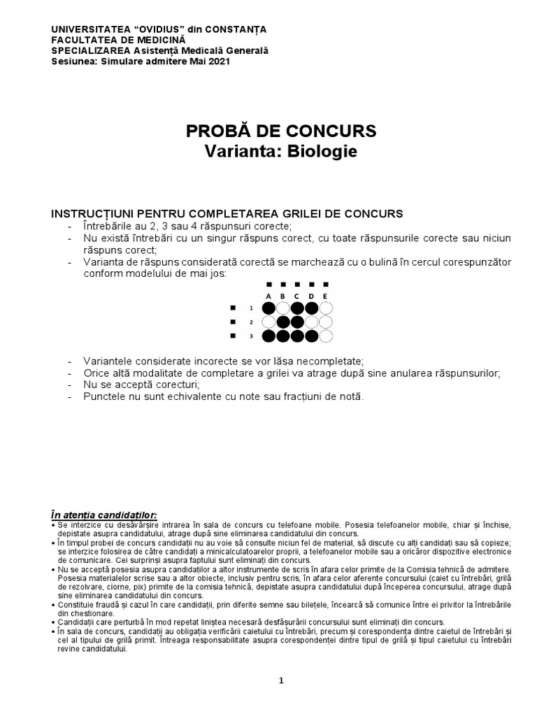 - Orice altă modalitate de completare a grilei va atrage după sine anularea răspunsurilor;