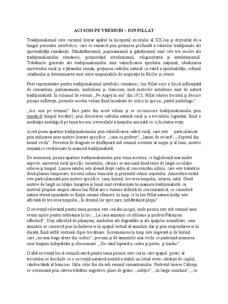 În concluzie, poezia „Aci sosi pe vremuri” de lon Pillat aparține liricii tradiționaliste prin