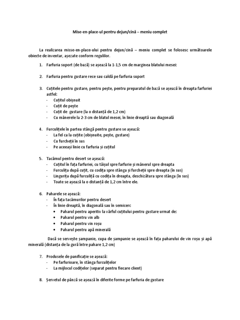 La realizarea misse-en-place-ului pentru dejun/cină – meniu complet se folosesc următoarele