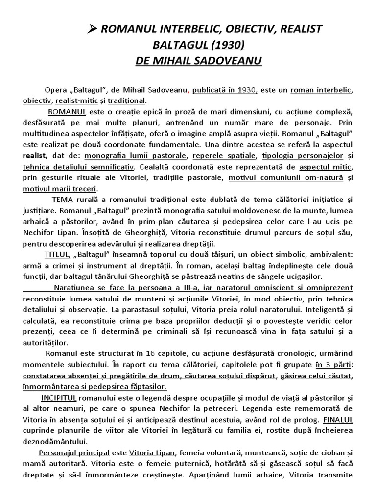 Opera „Baltagul”, de Mihail Sadoveanu, publicată în 1930, este un roman interbelic,