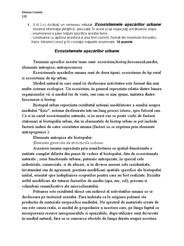 1. [Link].2.c) Alcătuiţi un minieseu intitulat „Ecosistemele așezărilor urbane”