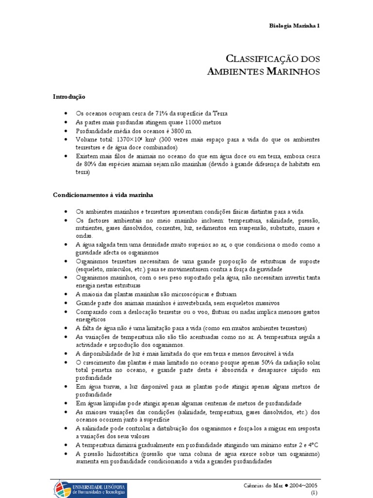 • Os factores ambientais no meio marinho incluem: temperatura, salinidade, pressão,