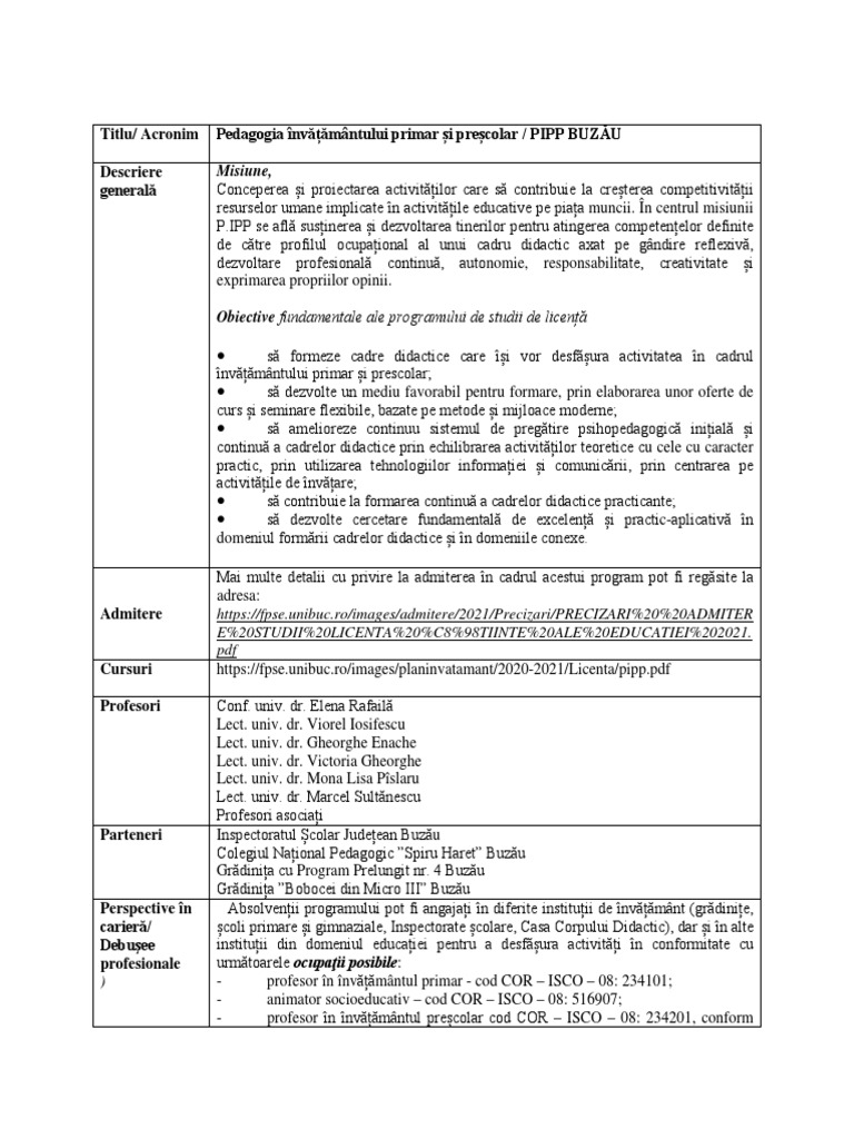 Titlu/ Acronim Pedagogia învățământului primar și preșcolar / PIPP BUZĂU