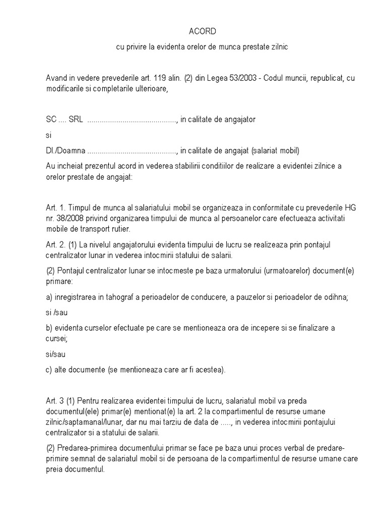 Art. 3 (1) Pentru realizarea evidentei timpului de lucru, salariatul mobil va preda