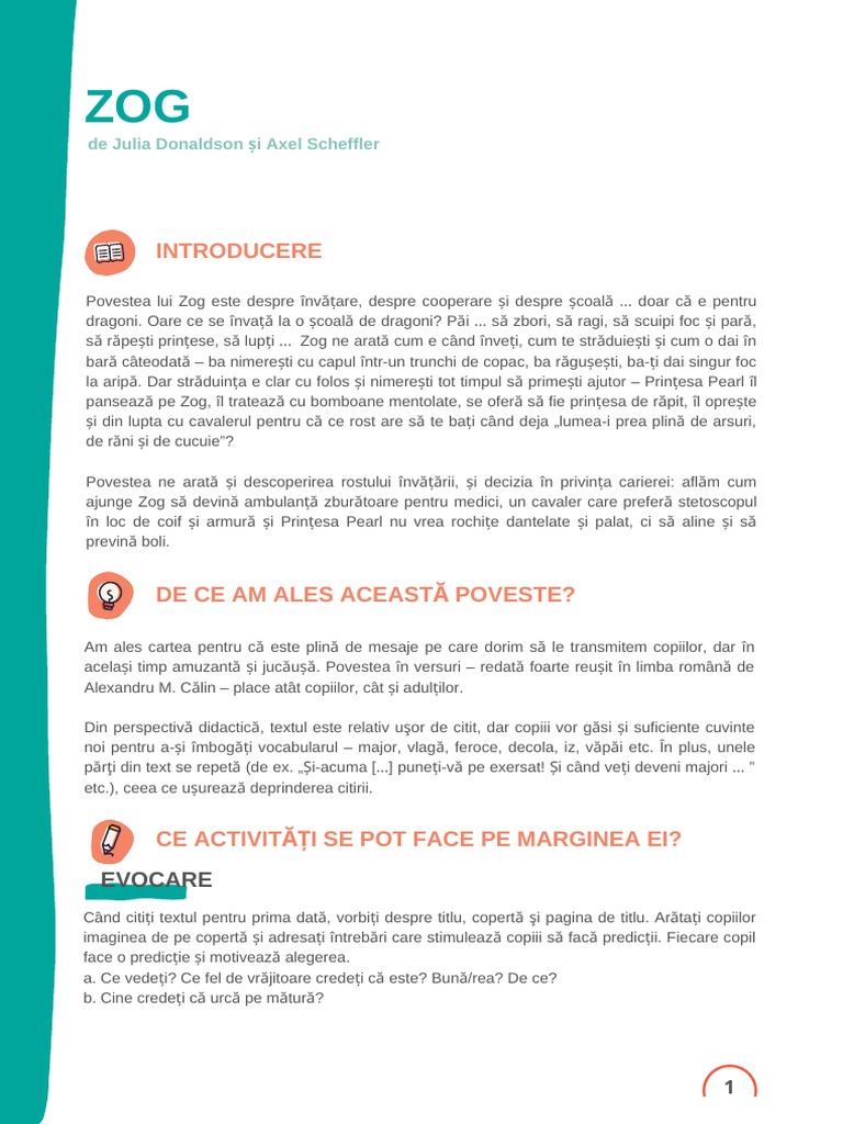 După ce terminați de citit, rugați copiii să vă ajute să rescrieți pe scurt povestea lui Zog. Notați pe