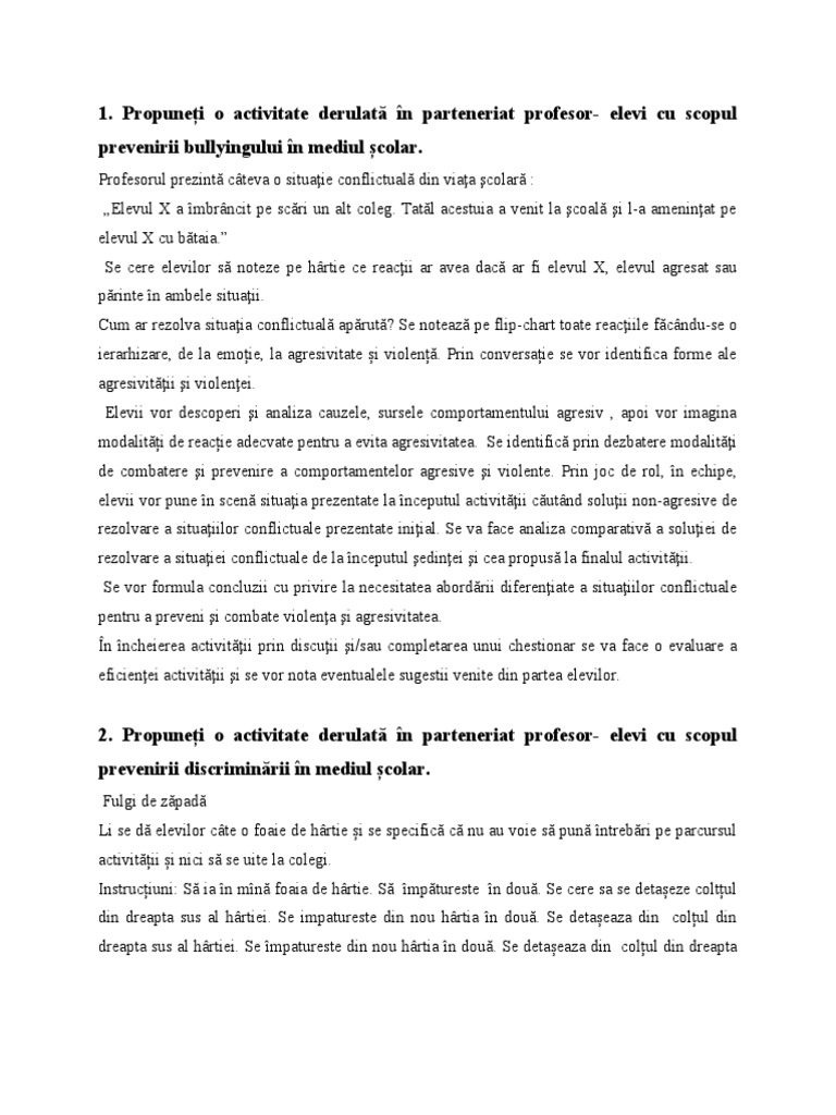 3. Propuneți o activitate ce poate fi derulată în mediul școlar cu scopul