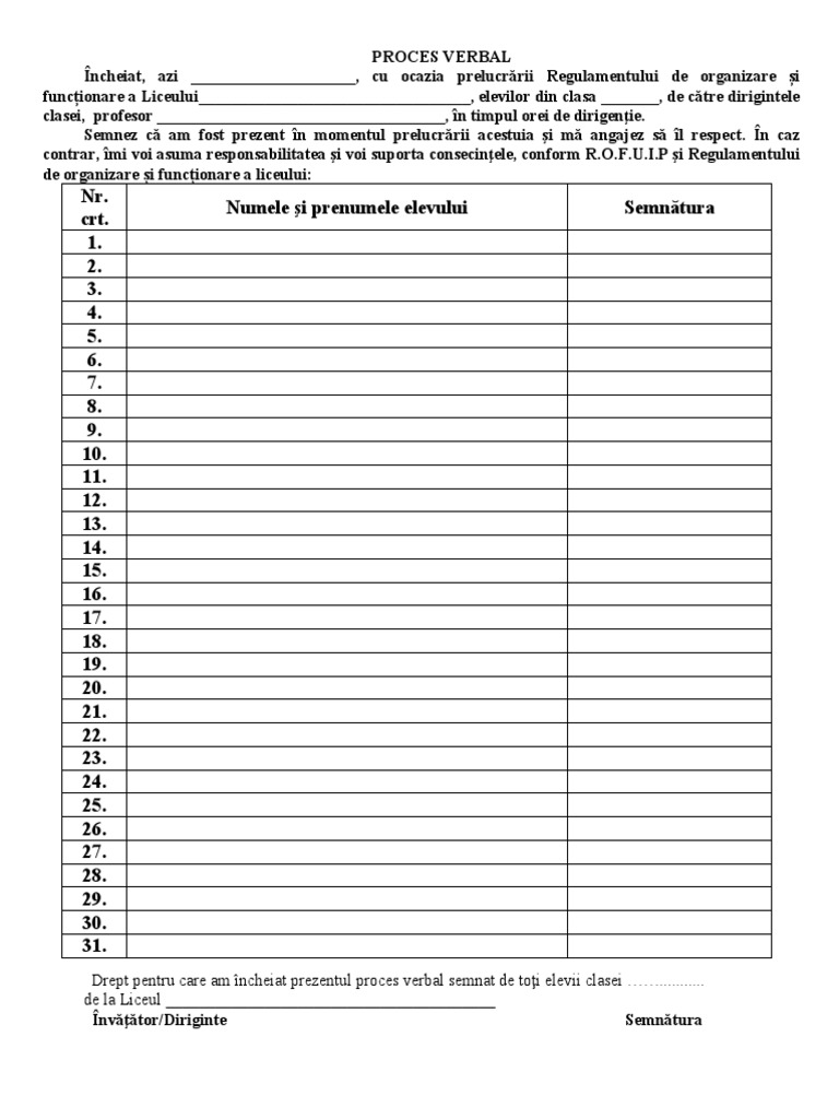Drept pentru care am încheiat prezentul proces verbal semnat de toţi elevii clasei ……...........