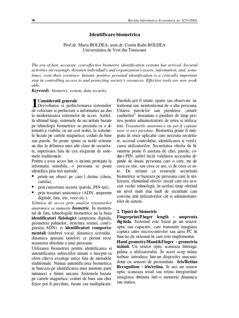 pe tehnologii biometrice se prezinta ca o al- tori. Trasaturile anatomice nu pot fi copiate