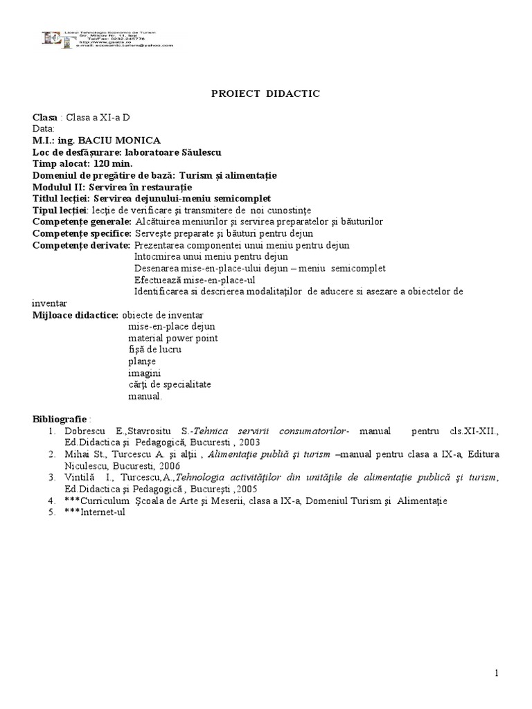 Titlul lecţiei: Servirea dejunului-meniu semicomplet