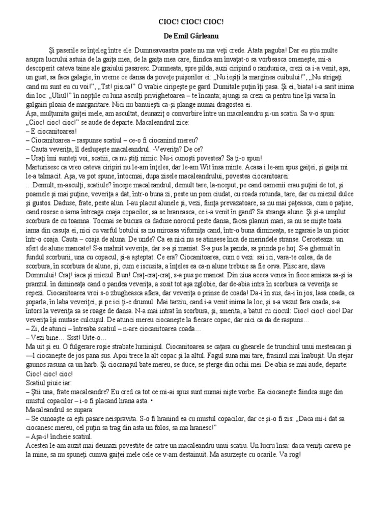 „Cioc! cioc! cioc!” se aude de departe. Macaleandrul zice: