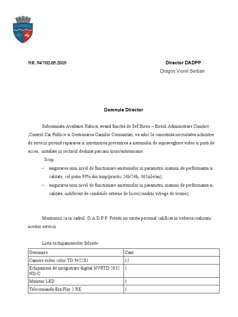 de servicii privind repararea si intretinerea preventiva a sistemului de supraveghere video si porti de