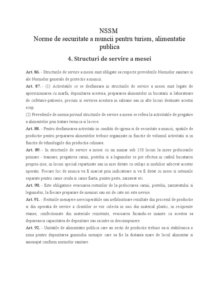 Art. 87. - (1) Activitatile ce se desfasoara in structurile de servire a mesei sunt legate de