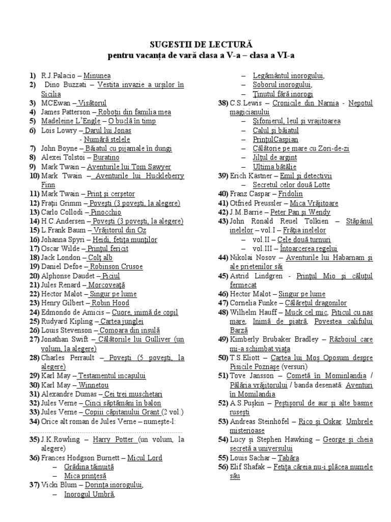 36) Frances Hodgson Burnett – Micul Lord 55) Louis Sachar – Tabăra