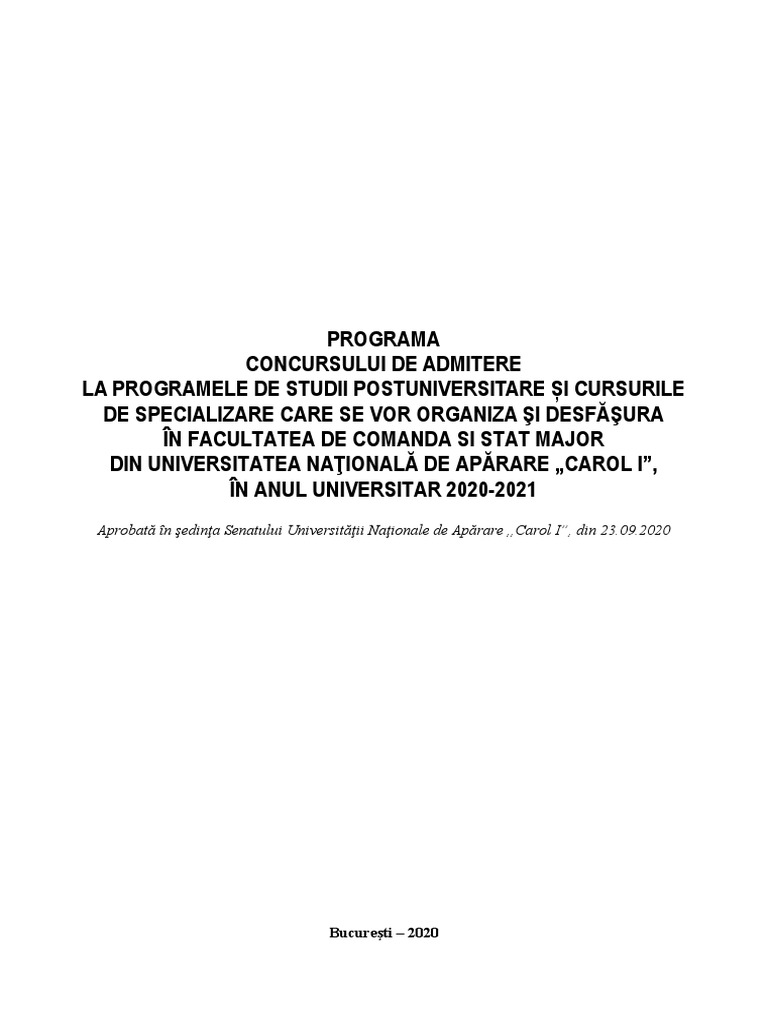 Aprobată în şedinţa Senatului Universităţii Naţionale de Apărare ,,Carol I”, din 23.09.2020