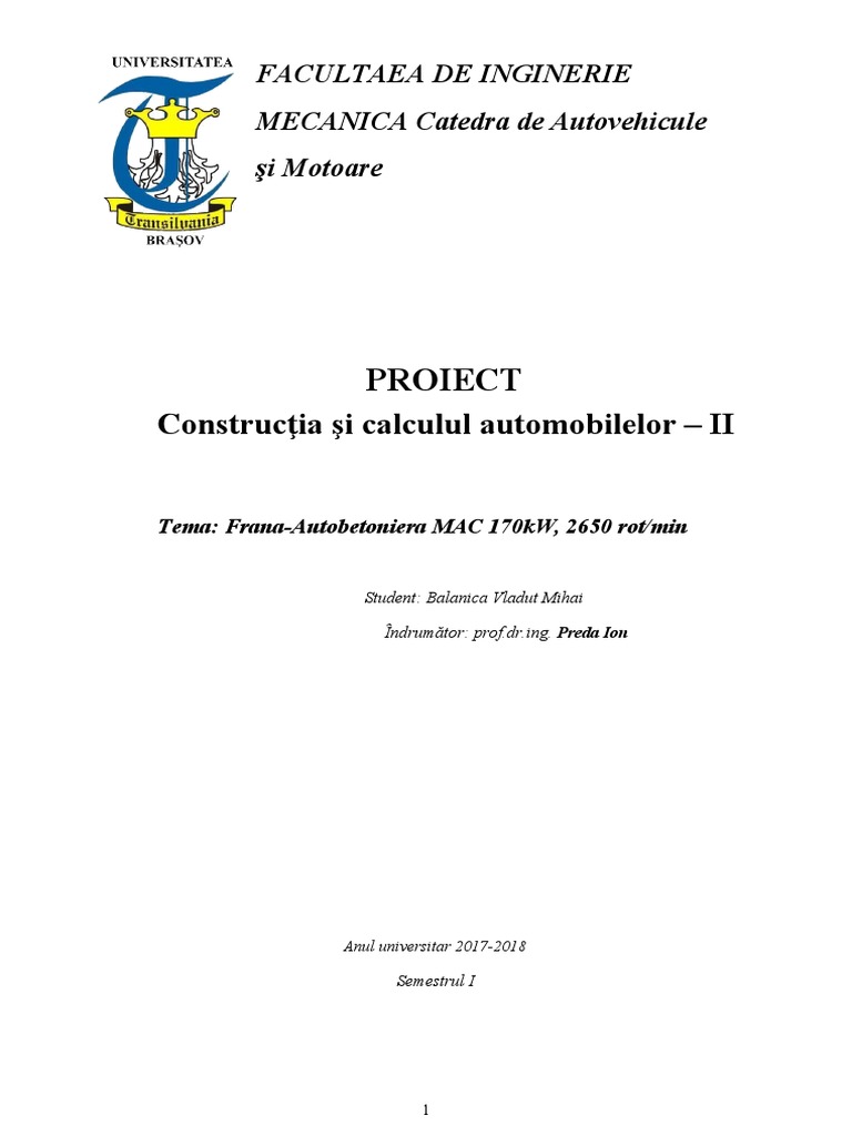 Tema de proiect prevede o Autobetoniera, de capacitate: C = 4,3 m , motor MAC,