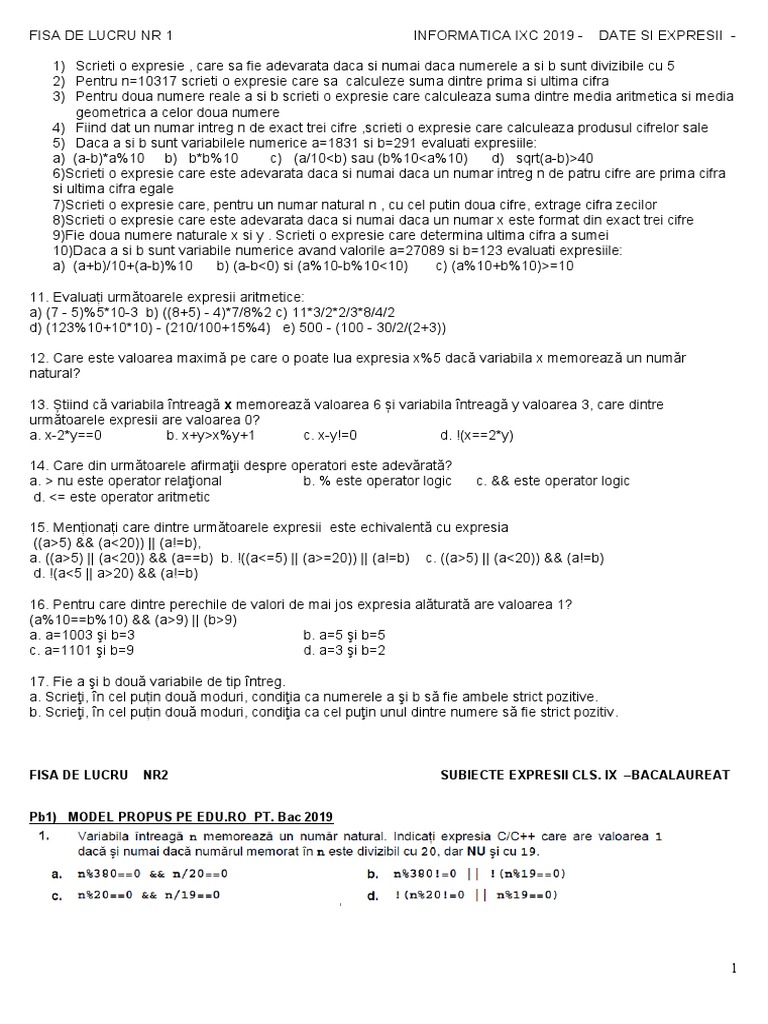 FISA DE LUCRU NR 1 INFORMATICA IXC 2019 - DATE SI EXPRESII -