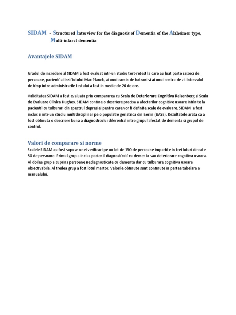 Validitatea SIDAM a fost evaluata prin compararea cu Scala de Deteriorare Cognitiva Reisenberg si Scala