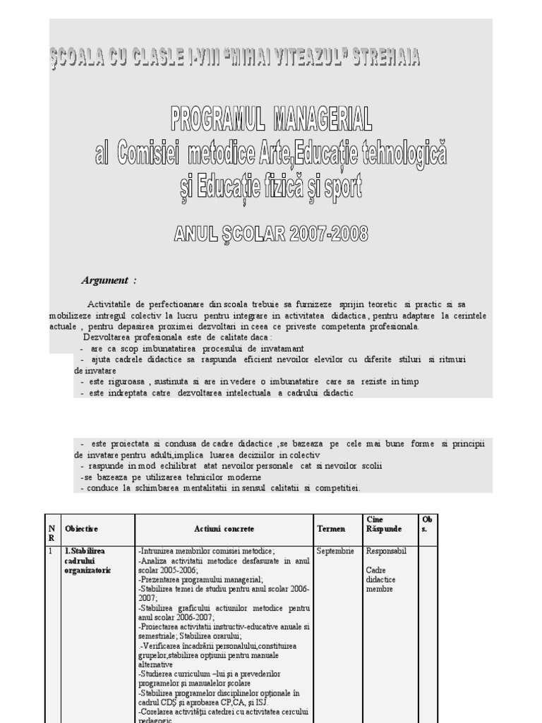 -Prezentarea programului managerial; didactice