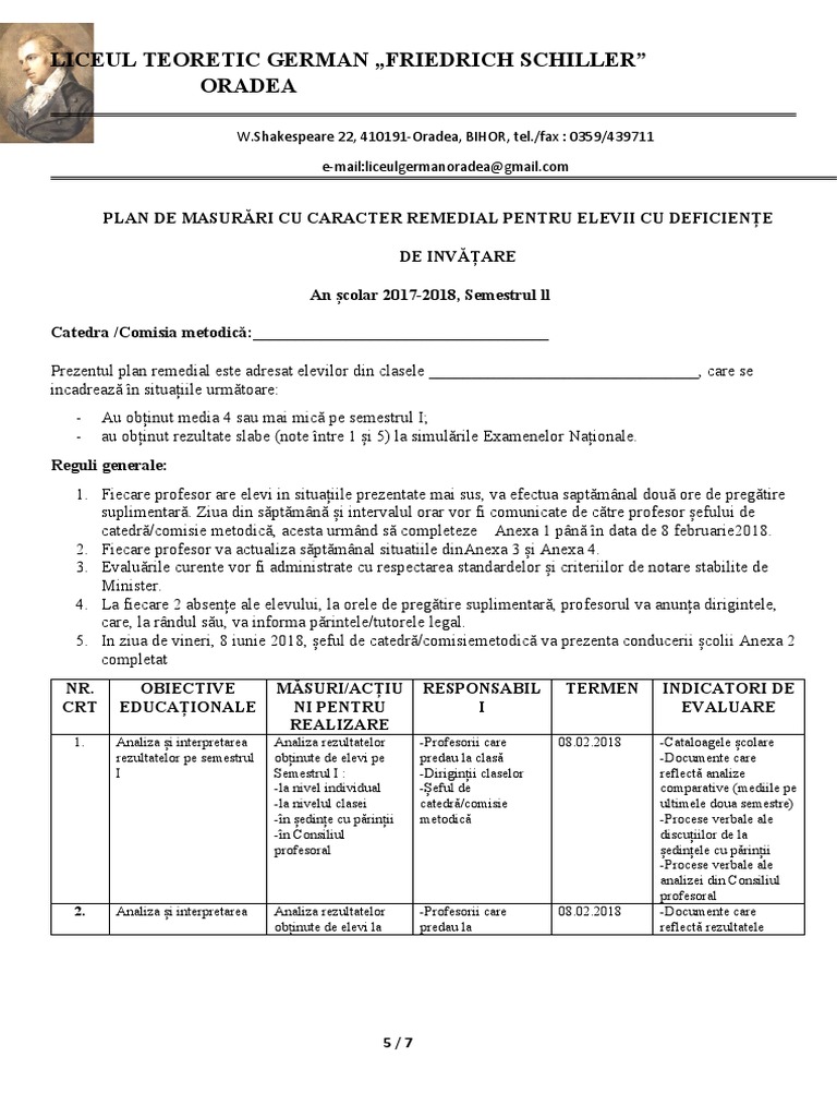 5. In ziua de vineri, 8 iunie 2018, șeful de catedră/comisiemetodică va prezenta conducerii școlii Anexa 2