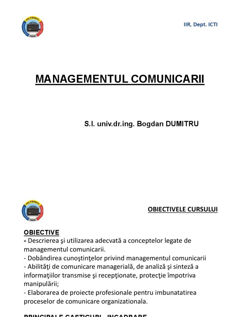 - Dobândirea cunoştinţelor privind managementul comunicarii