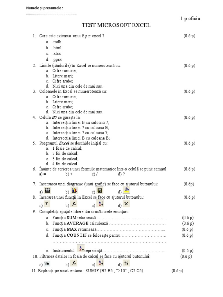 1. Care este extensia unui fișier excel ? (0.6 p)
