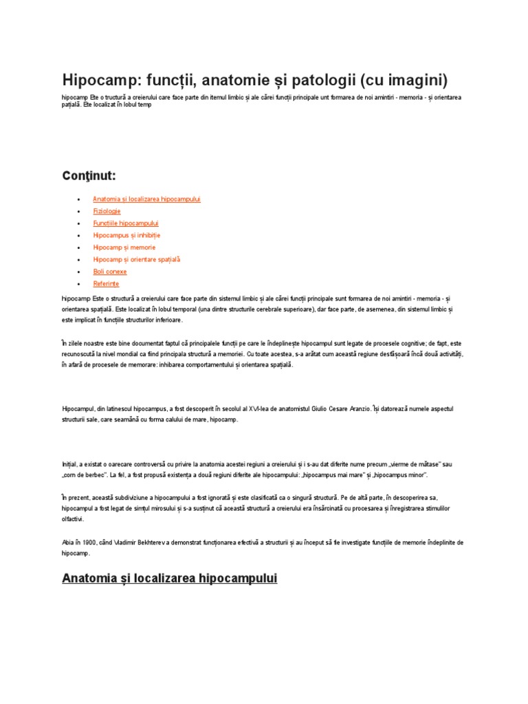 hipocamp Ete o tructură a creierului care face parte din itemul limbic și ale cărei funcții principale unt formarea de noi amintiri - memoria - și orientarea