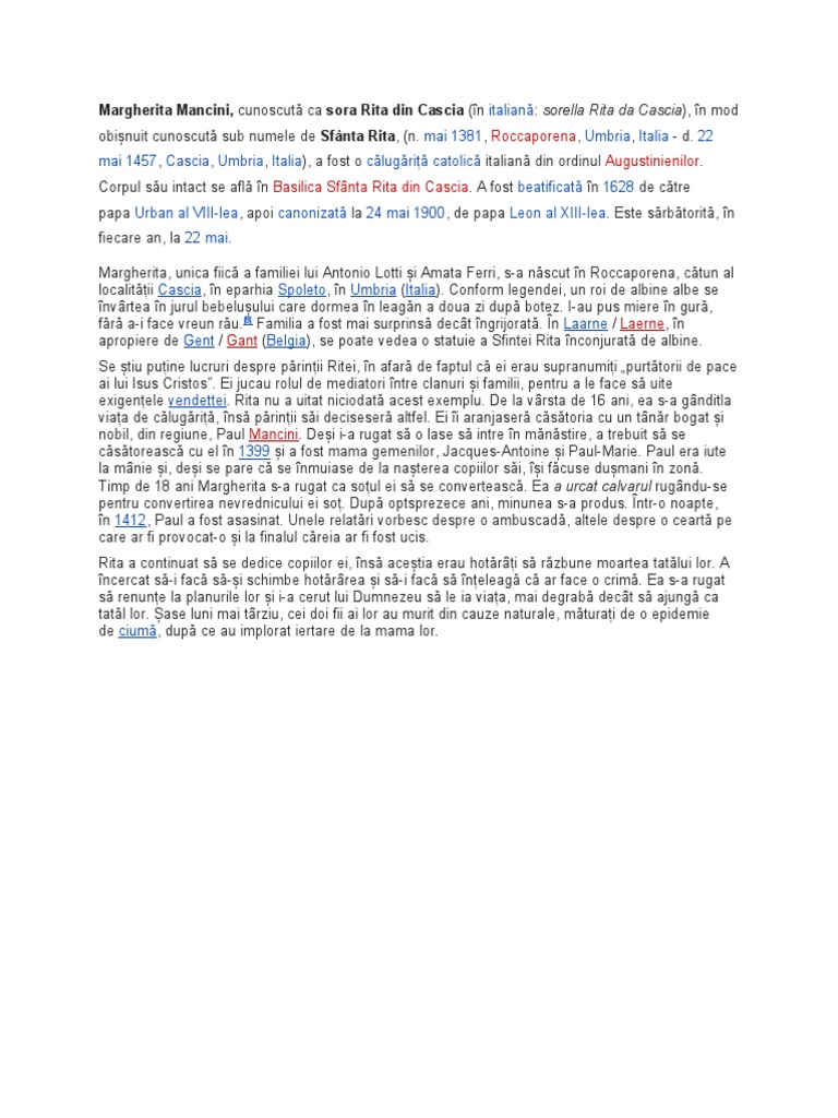 obișnuit cunoscută sub numele de Sfânta Rita, (n. mai 1381, Roccaporena, Umbria, Italia - d. 22