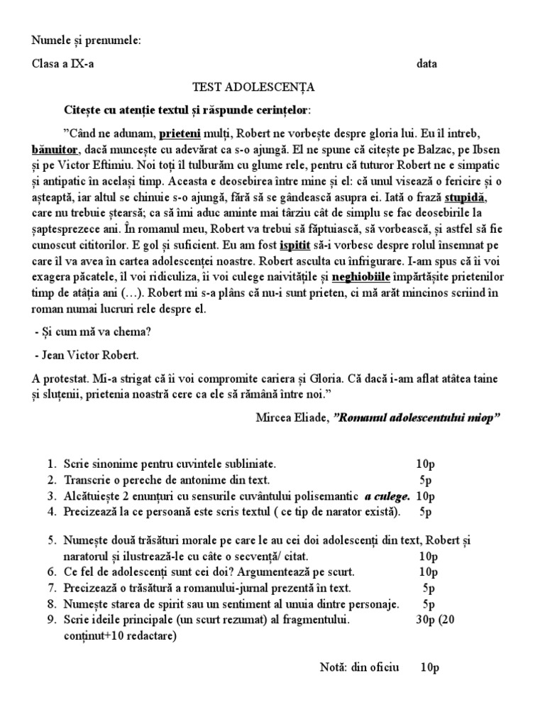 9. Scrie ideile principale (un scurt rezumat) al fragmentului. 30p (20