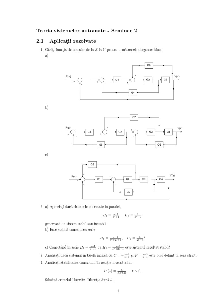 1. Găsiţi funcţia de transfer de la R la Y pentru următoarele diagrame bloc: