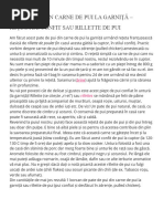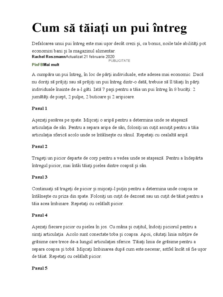 Documentul oferă 7 pași pentru a tăia un pui întreg în 8 bucăți: 2 jumătăți de piept, 2 pulpe, 2 butioare și 2 aripioare. Se explică cum să separi fiecare parte prin tăierea articulațiilor și a liniilor de grăsime, începând cu aripile și picioarele, apoi coloana vertebrală și în final tăierea pieptului în jumătăți.