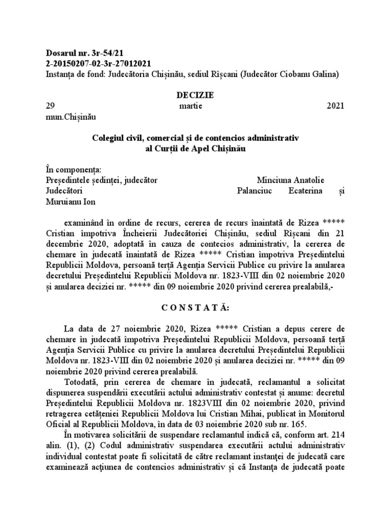 încheierii Judecătoriei Chișinău, sediul Rîșcani din 21 decembrie 2020.